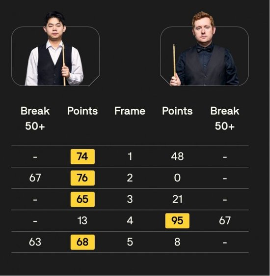 开场后袁思俊连胜三局并在第二局中打出单杆67分,第四局本·沃拉斯顿打出单杆67分扳回一城,第五局袁思俊打出单杆63分锁定胜局。
